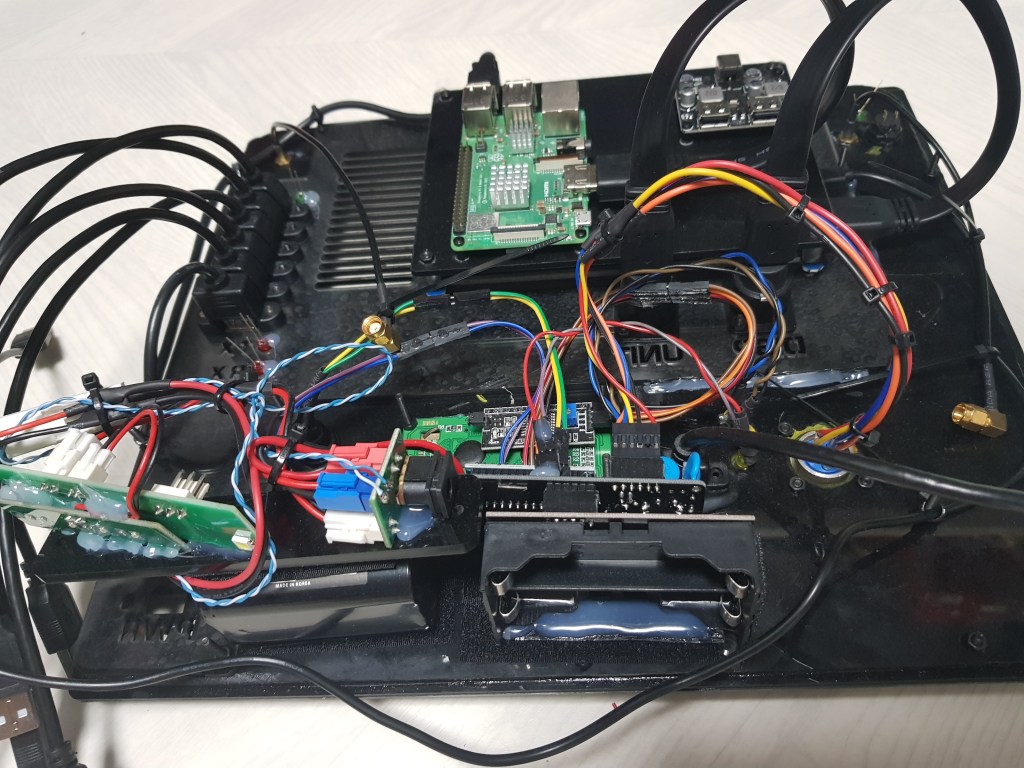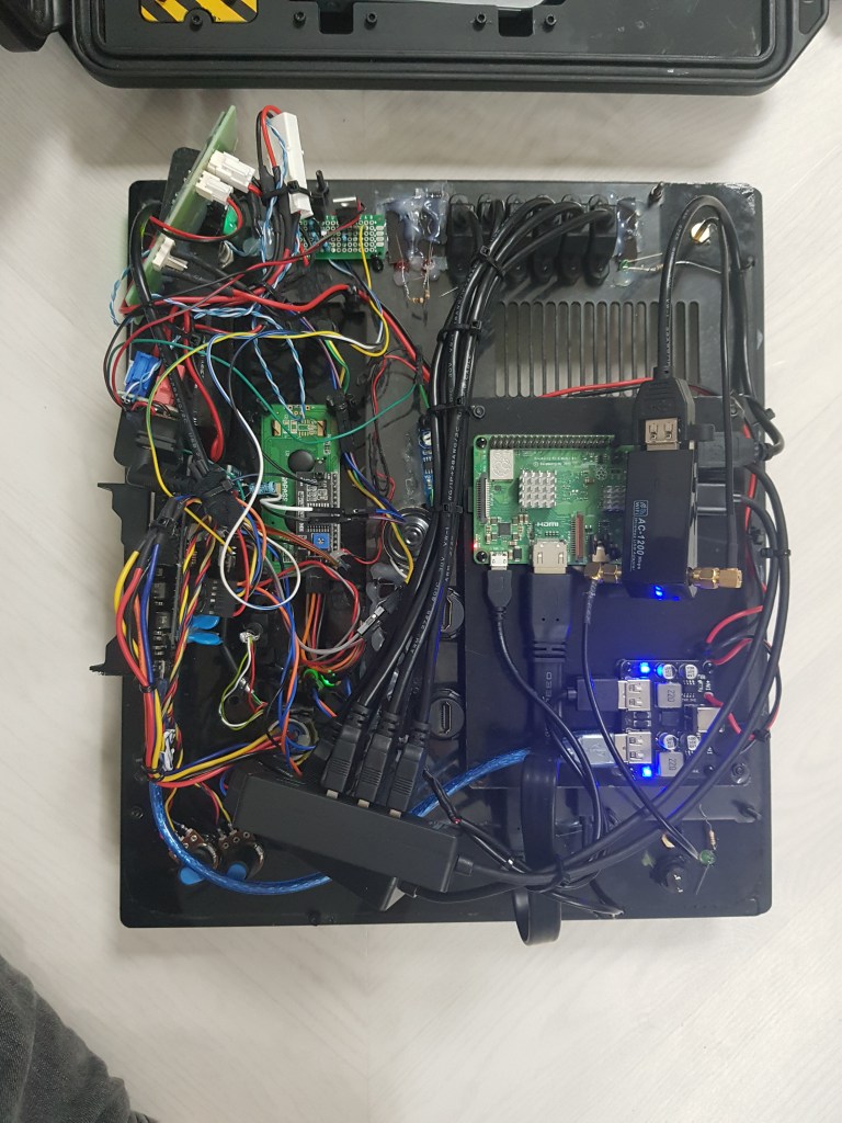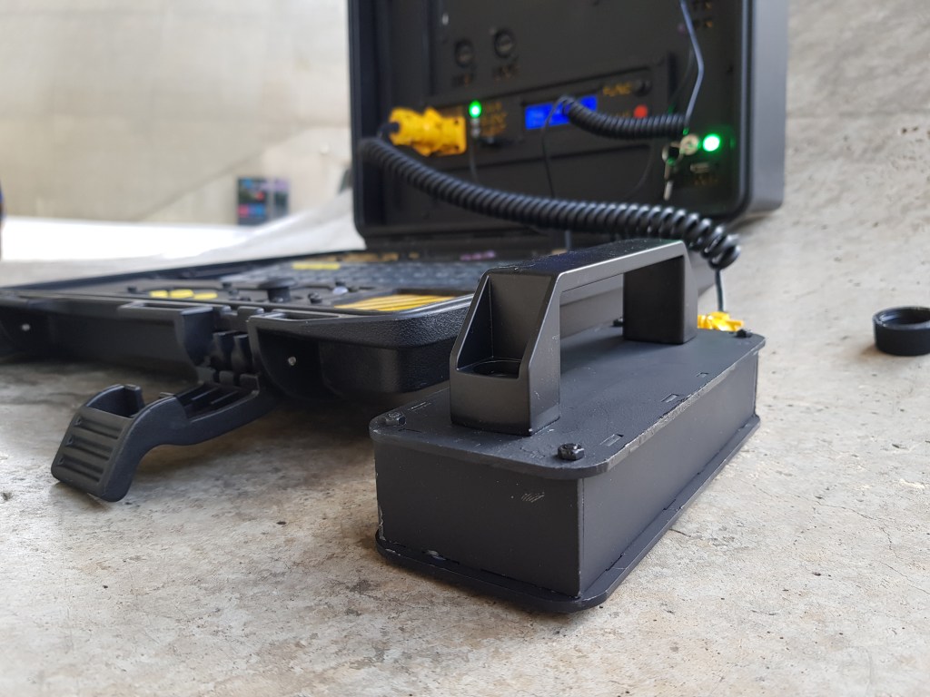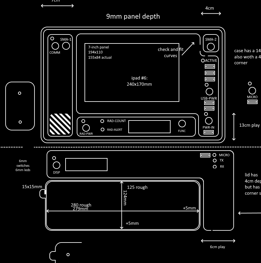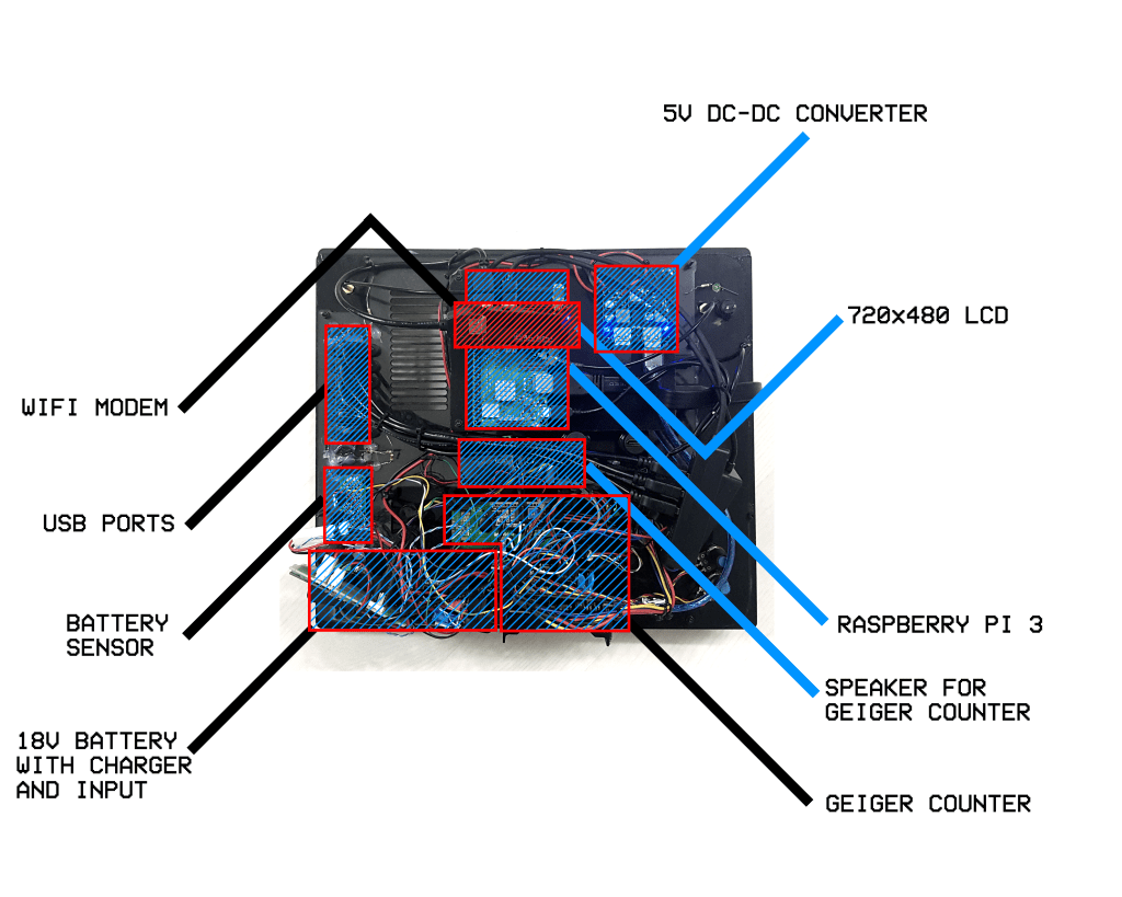 I have no direct access to 3D printers, and I run on a tight budget. As can be seen from the internals, the glamourous story of high tech military-industrial complexes creating boutique military hardware falls down flat when you actually scrutinize my electronics and realize it was probably made in a cave with scrap. The battery is from a vacuum cleaner, the battery sensor is of questionable design, the Geiger counter is a ball of wire but works quite well, the amount of USB ports are an afterthought (and way too many), and well, its all very silly.