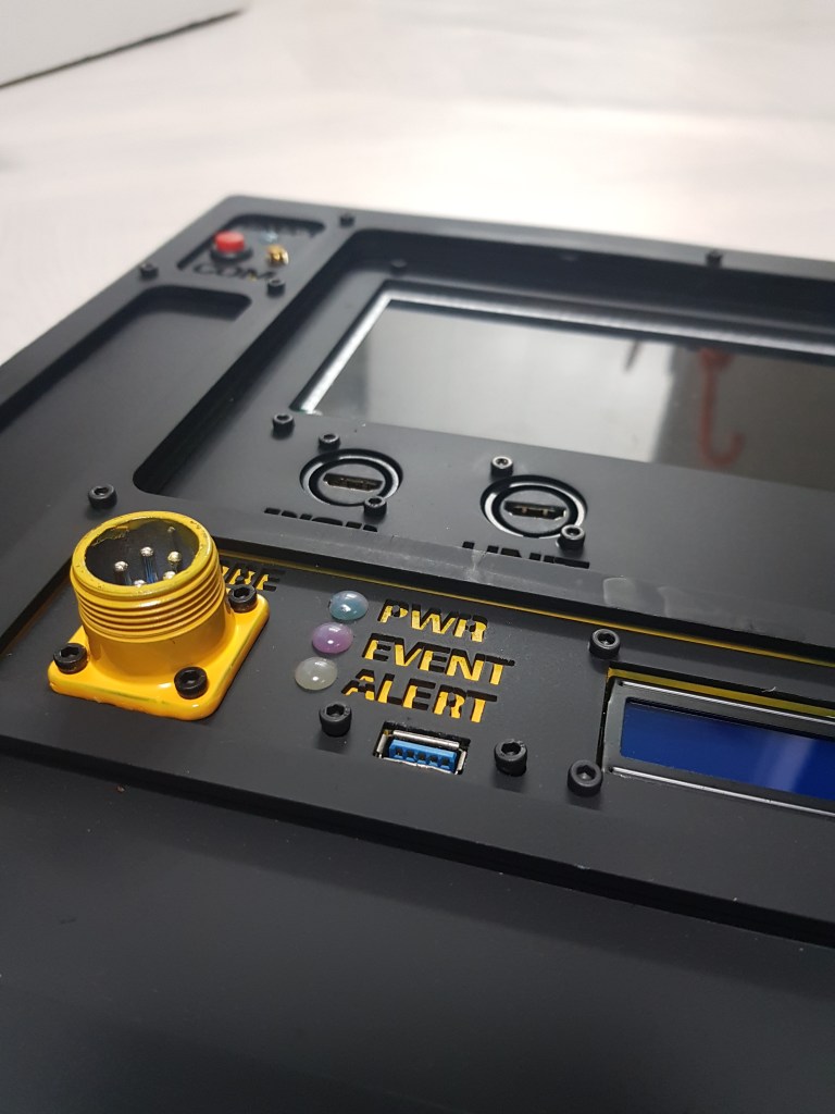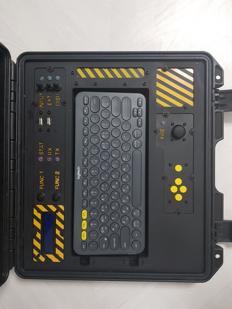 The keyboard (quite nicely shoehorned into the lid of the waterproof case, unlike the, um, actual main panel…) is a combination of wireless Logitech keyboard bunker (a carefully planned slot with magnets holds the keyboard in place), and an Arduino Leonardo connected to a small joystick, click function being right-click, a left-right-up-down set of buttons, and a FIRE button connected to a red LED when pressed. All of which becomes a USB controller when connected with USB to the main panel. This means that you could survive without a mouse, having the same functions available. Of course, the entire thing is reprogrammable, and the little panels were supposed to be removeable for prototyping, but I kinda just got tired and never developed it further. Maybe next time….
