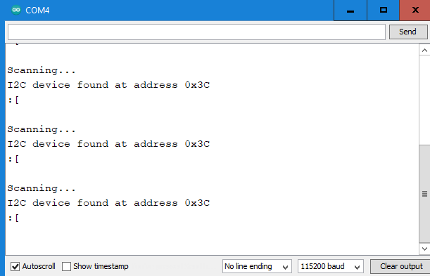 Success! We see the i2c OLED. This is useful, because the Chinese OLED clones use a different address from the Adafruit OLED modules, and so the i2c scanner can help you avoid much suffering and wasted time wondering why the device will not run.