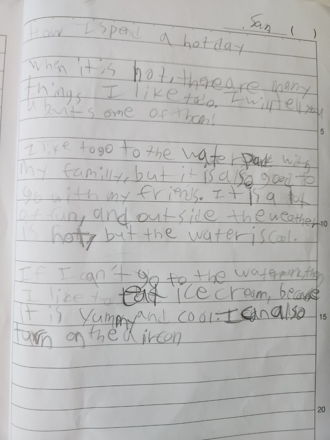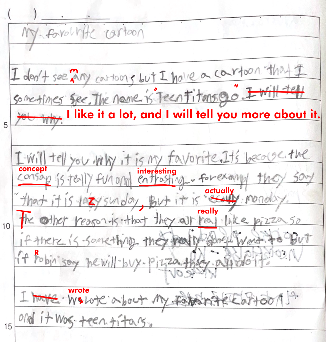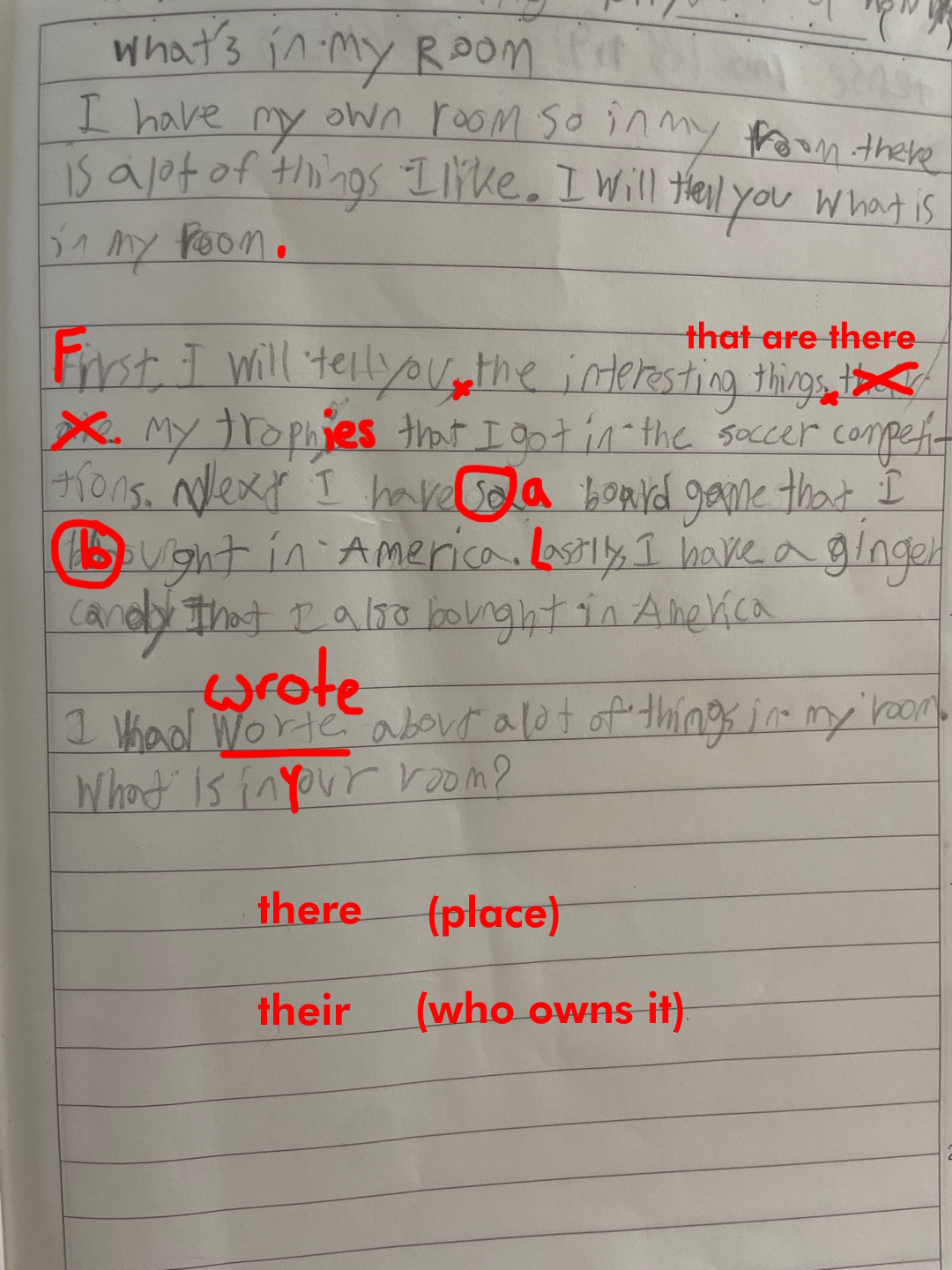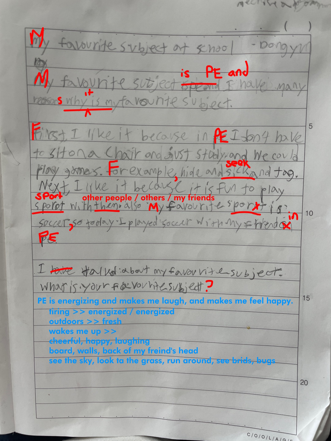 What subject do you like most at school? Talk about why its your favourite and how it makes you feel when you are in this class. You can also talk about the teacher and what you do in this class. Remember, an essay is at least three paragraphs, and putting spaces between paragraphs makes it easier to read and write!