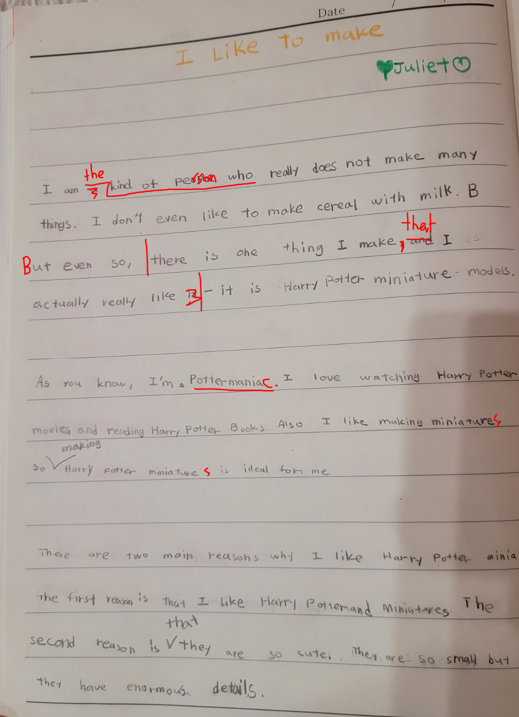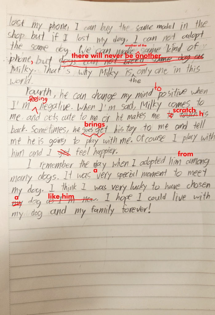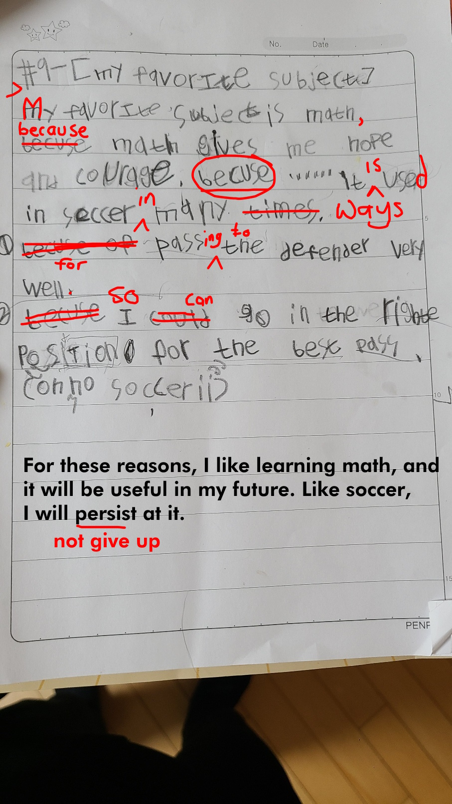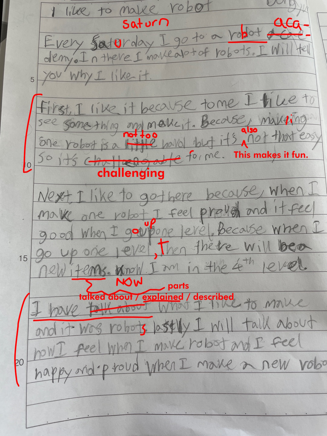 What subject do you like most at school? Talk about why its your favourite and how it makes you feel when you are in this class. You can also talk about the teacher and what you do in this class. Remember, an essay is at least three paragraphs, and putting spaces between paragraphs makes it easier to read and write!