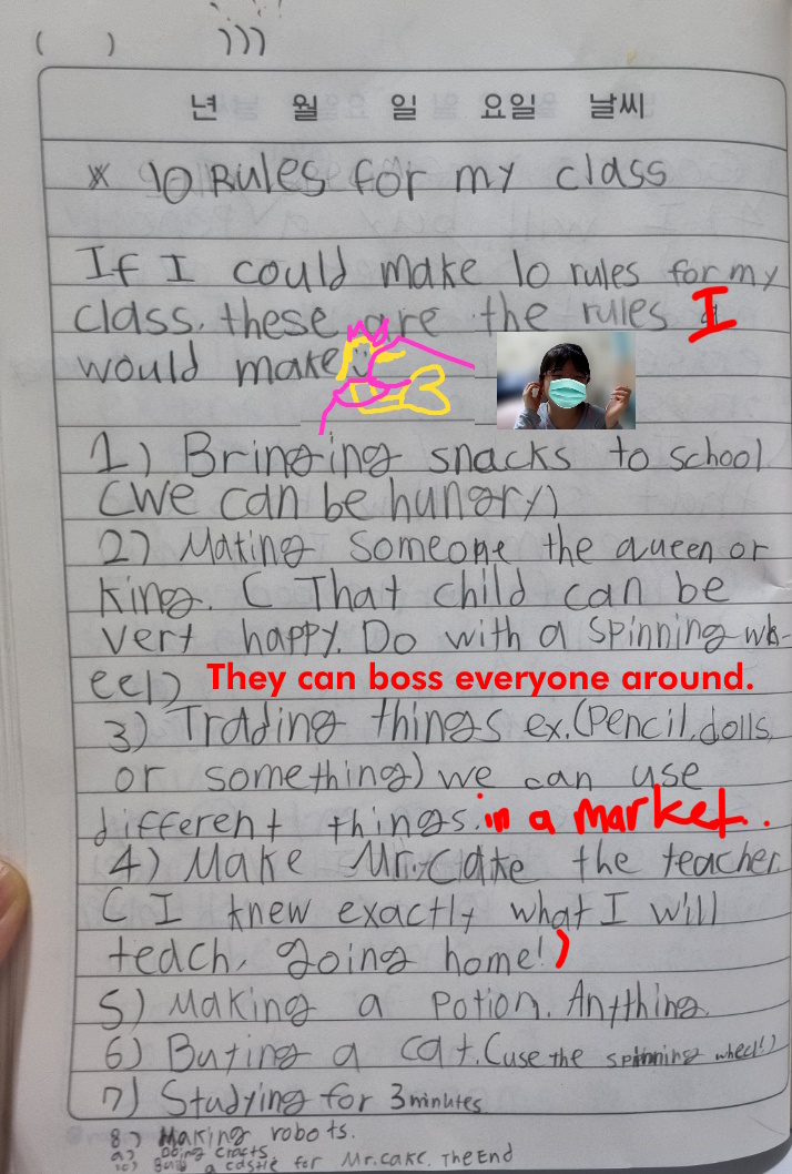 학생들과 선생님이 더 행복해지고, 학습이 더 나아지도록 하기 위해 당신이 만든다면 어떤 규칙을 만들겠습니까? 혹은, 무시무시한 규칙들로 어둠과 파멸의 지배를 펼치는 사악한 규칙 제정자가 되시겠습니까!? 당신이 왜 그런 선택을 했는지, 그리고 그것이 수업을 어떻게 바꿀지 설명하세요.