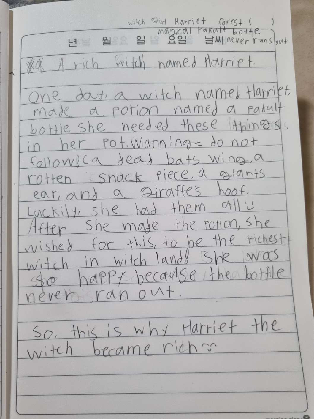 #X – [Special Story Writing]: Write a story about a witch, a girl called Harriet, a forest, and a magical Yakult bottle that never runs out. (Spaullulana marches in!)