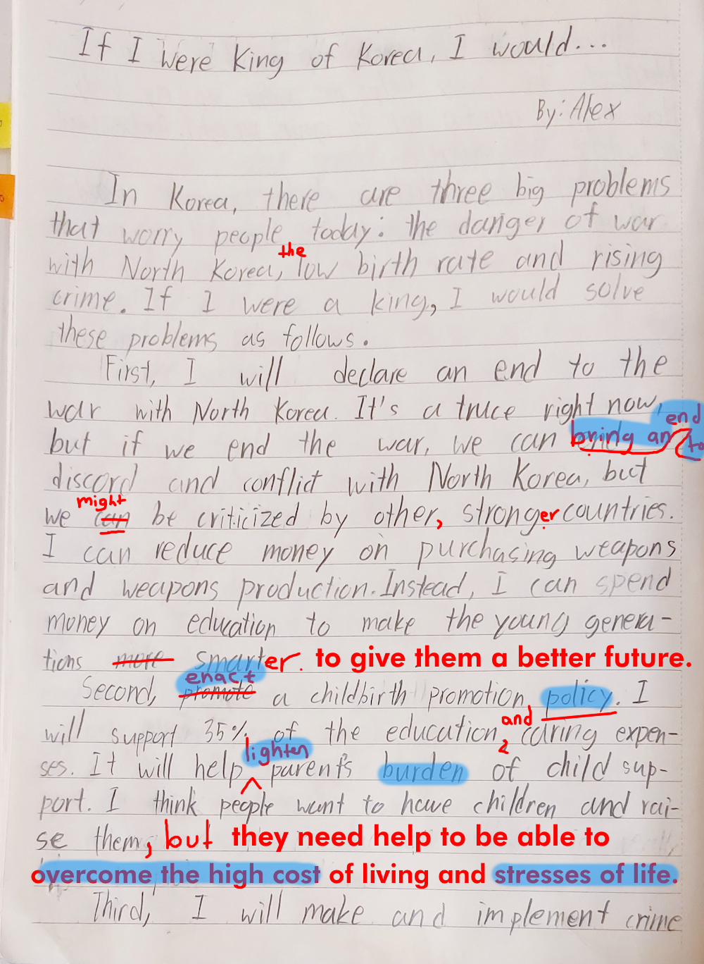 Imagine you are the ruler of Korea for a day. Think about three big problems that worry people today. Then, decide what changes you would make to solve those problems. Explain how each change would help improve your own life and the lives of other people. Write one paragraph about each change, and that will be enough for a full essay.