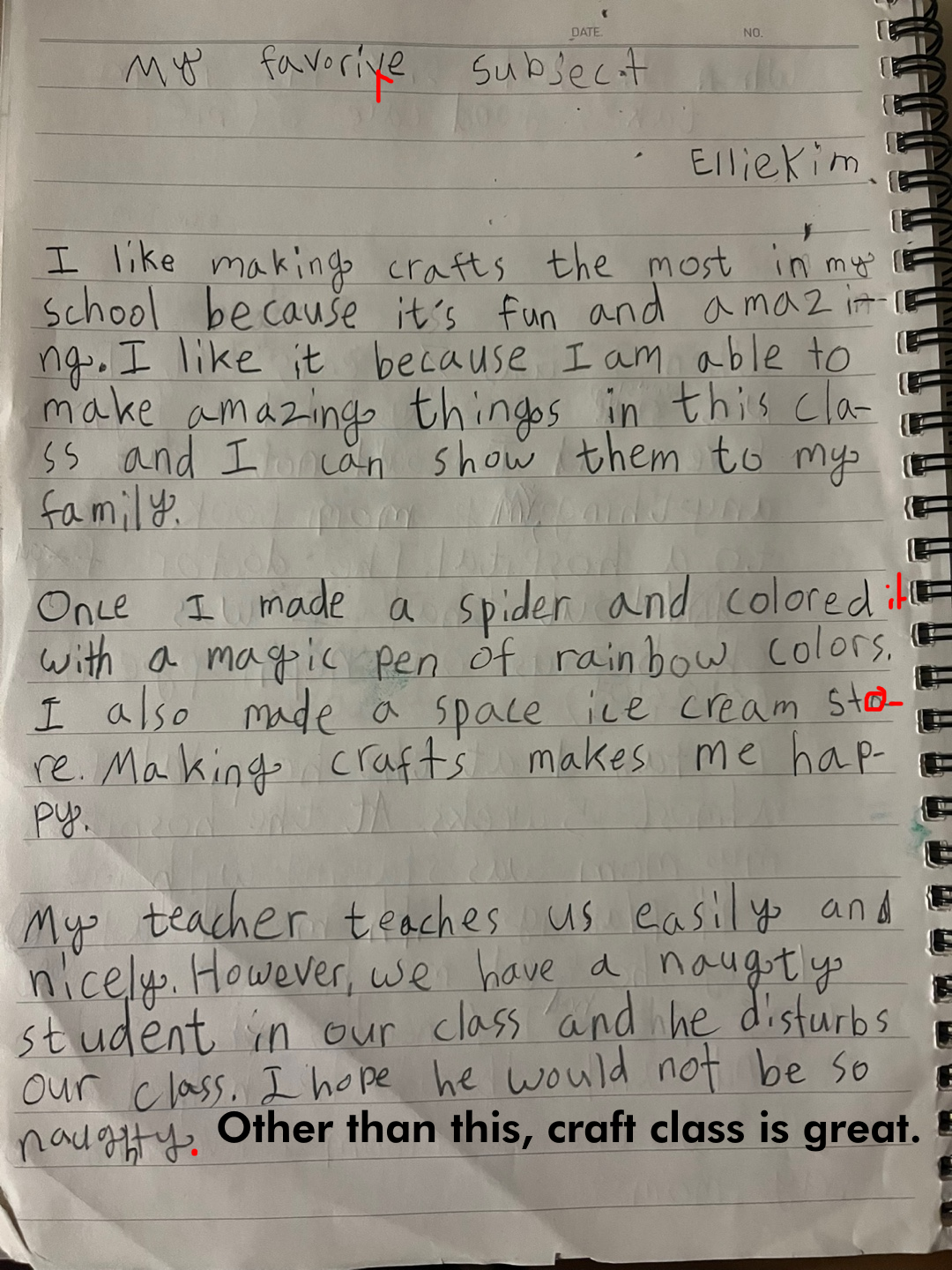 What subject do you like most at school? Talk about why its your favourite and how it makes you feel when you are in this class. You can also talk about the teacher and what you do in this class. Remember, an essay is at least three paragraphs, and putting spaces between paragraphs makes it easier to read and write!